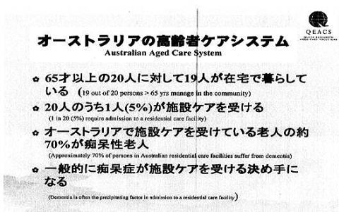 日本との交流も15年前から始まっていて、記録映画の名匠・羽田澄子監督の代表作『安心して老いるために』ではオーストラリアの舞台として登場している。そのドキュメント映画は、軟弱な日本の福祉政策に一石を投じた話題作となった。過去7年の日本人研修生の数は2400人にのぼるというから草の根レベルでの浸透度はかなり深そうだ。最近では、日本の大手日刊紙の論説委員さえ取材で滞在し社説に3日間連載されたというから、その注目度はもう草の根レベルとは呼べないのかもしれない。