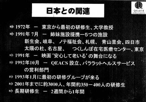 * クイーンエリザベス国際医療福祉教育研修センター(Q.E.A.C.S) 1992年lO月 に日本人用に高齢者教育を提供する為に独立機関として発足、その他香港の看護婦も卒後教育の実習に来る