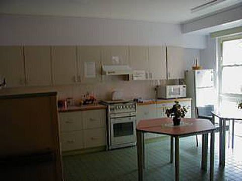 長期滞在用の老人施設の床は暖色系のカーペットである。こじんまりとした家庭用キッ